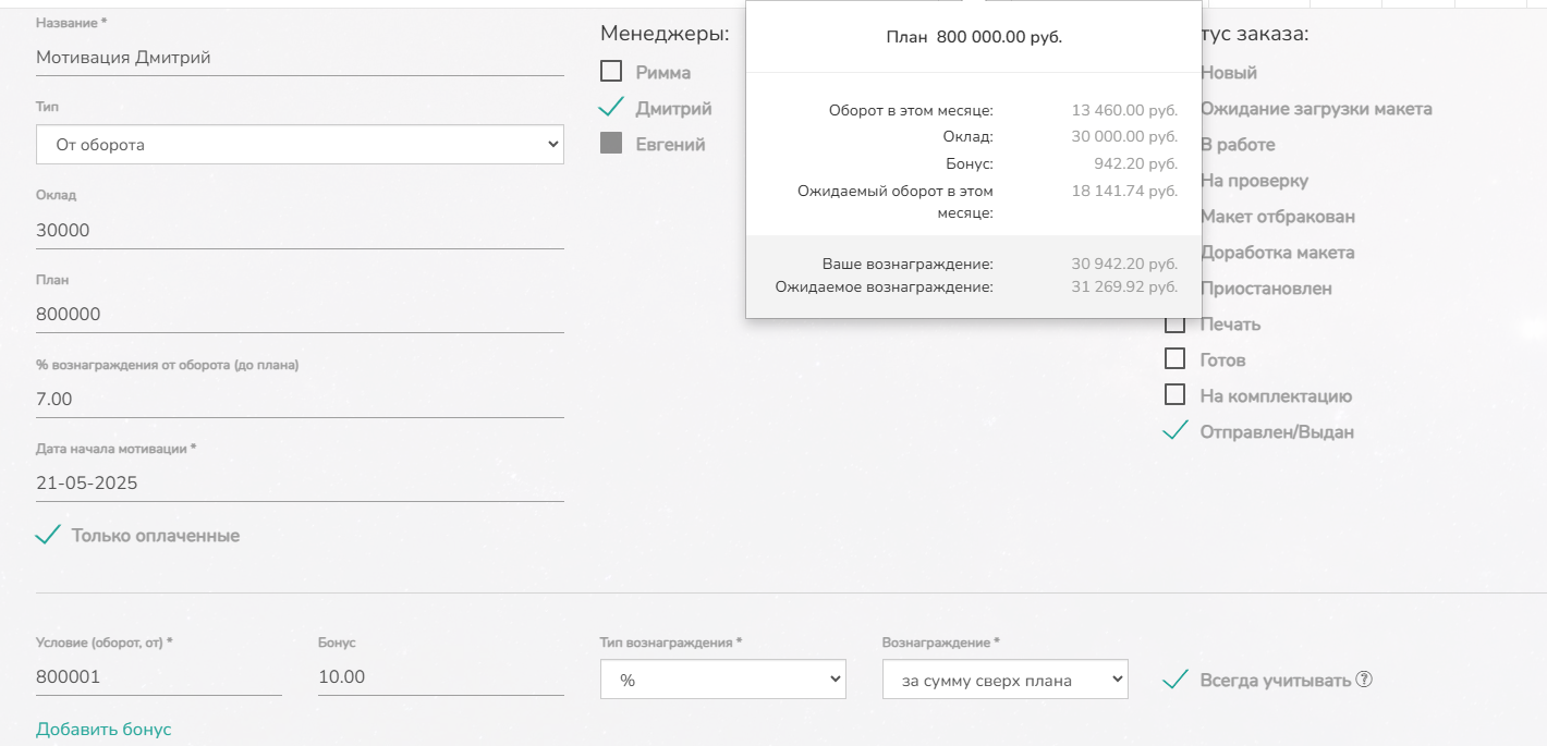 Сегодня мы хотим рассказать о таком модуле как «Мотивация менеджеров». Вы можете легко создавать персональные планы продаж и система автоматически рассчитает вознаграждение за каждый завершённый заказ.