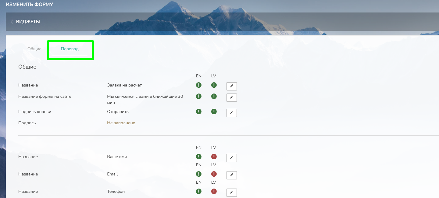 Теперь в интерфейсе настроек виджета появилась отдельная вкладка «Перевод». В ней вы можете легко локализовать на любой язык все текстовые строки, которые ранее задавали во вкладке «Общие»: заголовок, подписи кнопок, названия полей для заполнения формы.