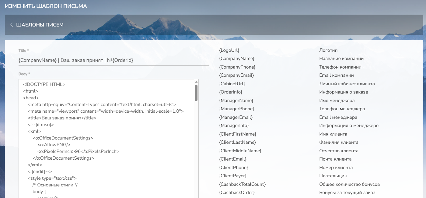 Раздел «Настройки → Другие настройки → Шаблоны email-писем» (требуется модуль «Индивидуальный дизайн писем»).