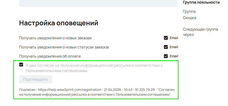 Клиент может подтвердить согласие прямо в настройках профиля — изменения фиксируются сразу.