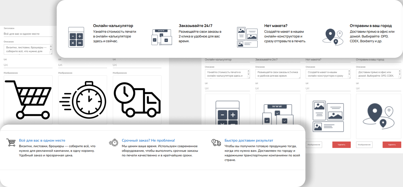 Для этого у вас есть два инструмента: виджеты «Преимущества» и «Преимущества Mini». Они структурируют информацию о сильных сторонах вашей типографии и выгодно подают её на странице.