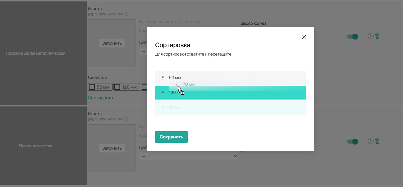 Раньше свойства комплектующих отображались на сайте в порядке их создания в справочнике (например, размеры пружины: 50мм, 100мм, 70мм), что было неудобно при добавлении новых параметров.